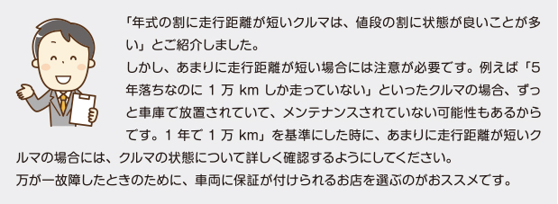 中でも、年式の割に走行距離が短いクルマは、値段の割に状態が良いことが多いです。